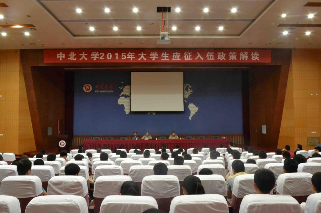 为了进一步做好2015年大学生应征入伍宣传工作,6月3日上午,我校武装部邀请了尖草坪区武装部副部长杨军、军事训练科科长韩涛,在我校图书馆五层学术报告厅进行了2015年大学生应征入伍政策解读。