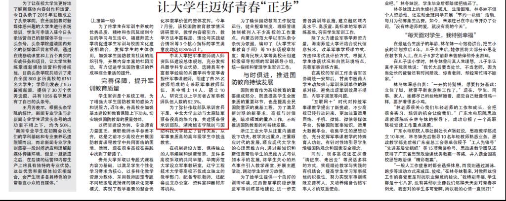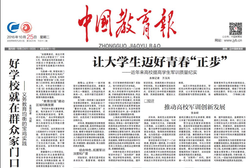 10月25日出版的《中国教育报》刊登了“让大学生迈好青春正步——近年来高校提高学生军训质量纪实”的署名文章,其中对我校充分发挥兵器学科专业优势,加强军事教师队伍建设,以及主动与太原陆军预备役高炮旅合作,共建预备役承训部队等的做法进行了报道。