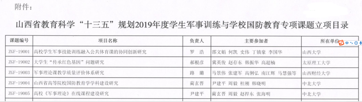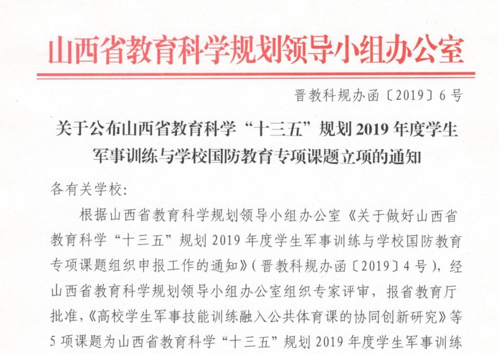近日,山西省教育科学“十三五”规划 2019年度学生军事训练与学校国防教育专项课题立项通知正式公布,我校军事教师尹建平主持的《高校军事理论在线课程建设研究》、蔺玄晋主持的《山西省高等学校国防教育学学科建设研究》分别获批重点研究课题,取得了我校在学生军训和国防教育科研领域新的突破。