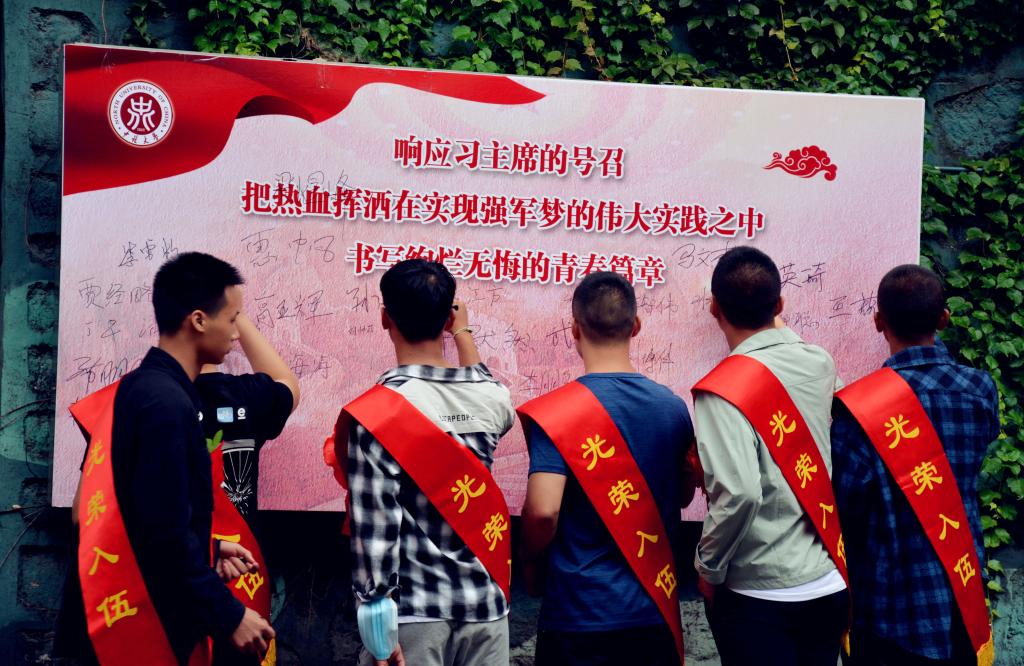 薛书记讲话后,全体同学高唱《强军战歌》,并在“响应习近平总书记的号召,把热血挥洒在实现强军梦的伟大实践之中,书写绚烂无悔的青春篇章”签名墙签名。