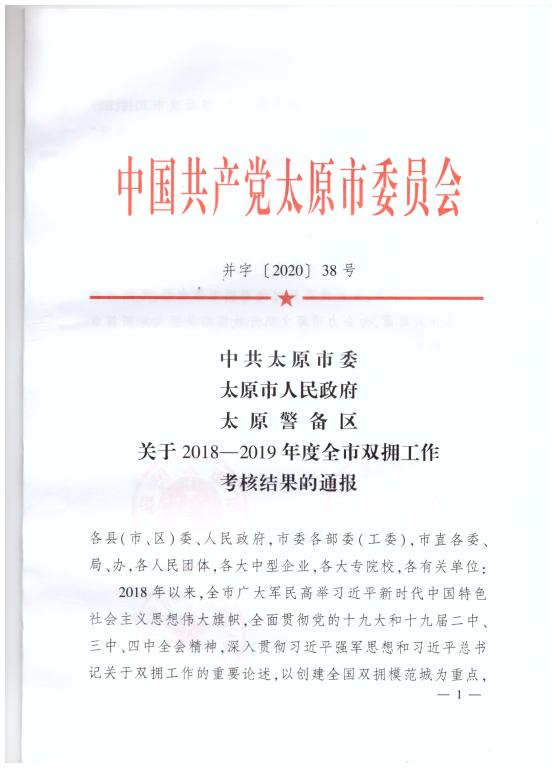 近日,中共太原市委、太原市人民政府、太原警备区联合下发了《关于2018-2019年全市双拥工作考核结果的通报》,我校喜获“双拥先进单位”称号。