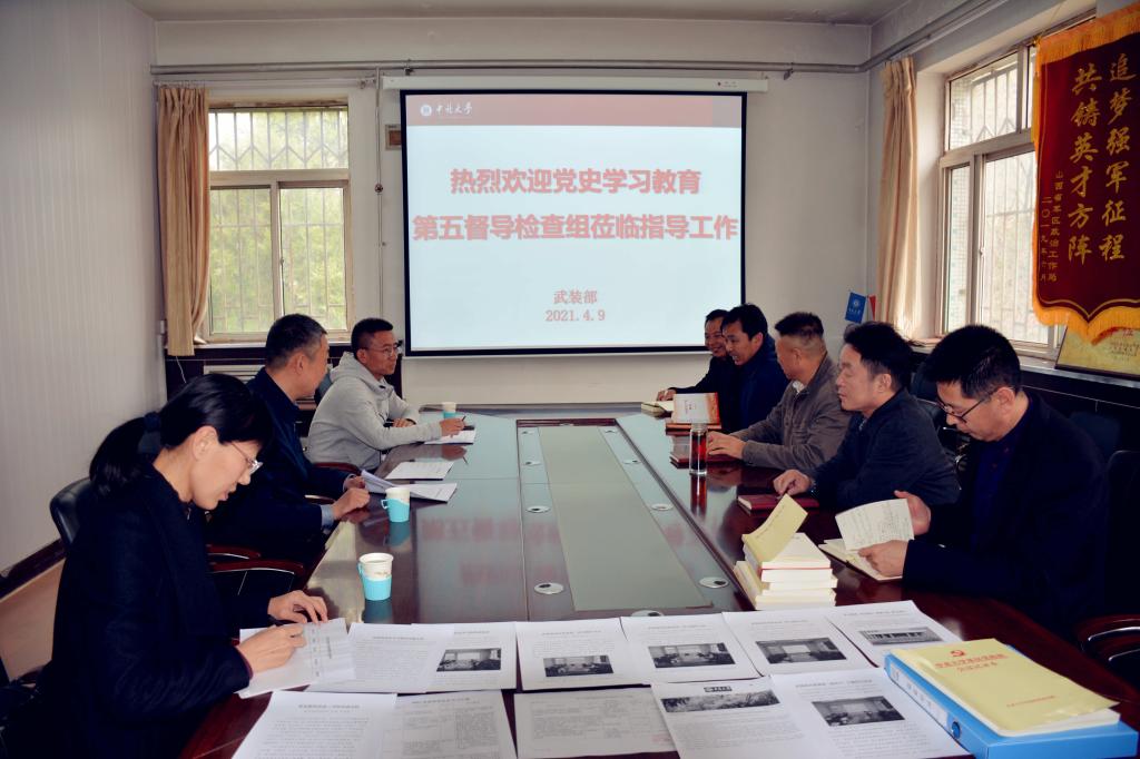 4月9日下午,校党史学习教育第五督导检查组刘汉涛等一行3人到武装部指导党史学习教育工作。