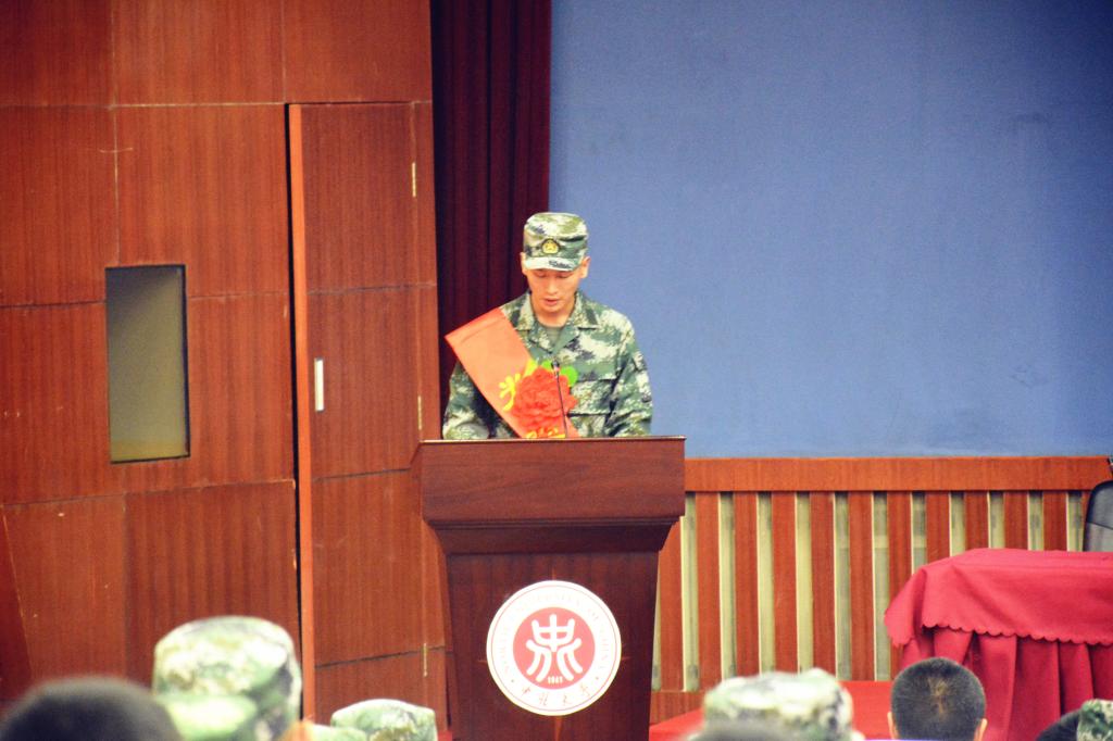 2015年退伍大学生士兵代表、在部队被评为优秀士兵的卢浩同学发言,寄语新兵入伍后在提高执行力、提高为人处世能力、加强自我挑战和突破等三个方面磨炼自己。离开母校,要“忘记”大学生身份,服从指挥、扎实训练、融入部队,力争早日实现身体素质过硬、军事技术娴熟,努力做一名合格军人。
