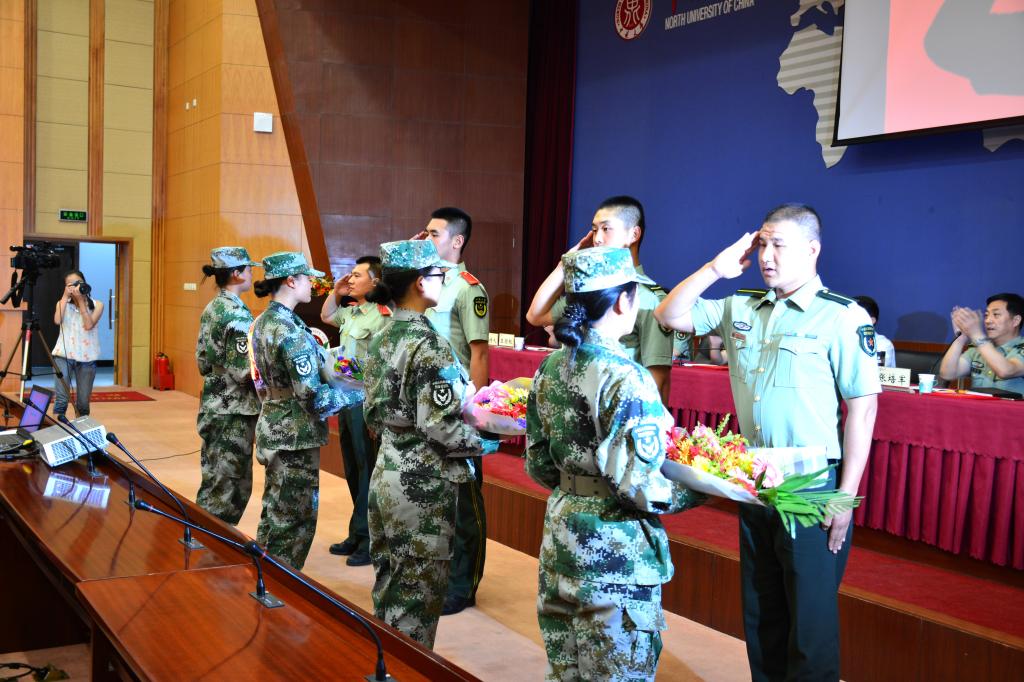 报告会上,学生代表首先为优秀大学生士兵献花。